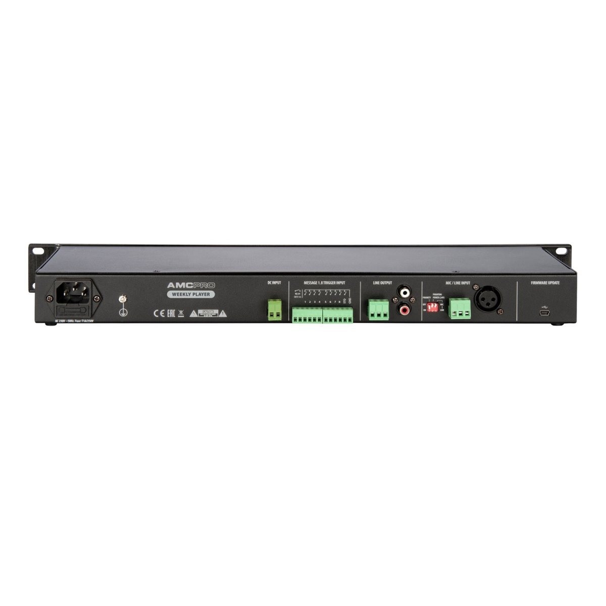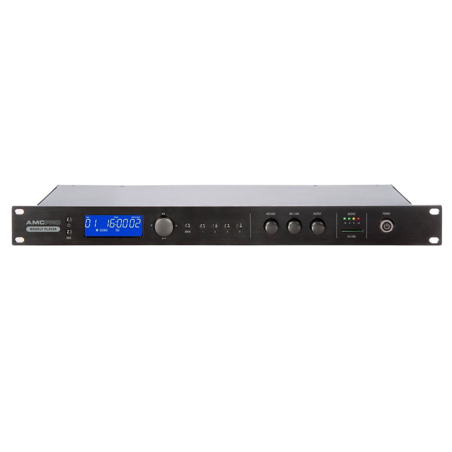 AMC rozszerzyło ofertę swoich produktów o Weekly Player, stworzony do odtwarzania zaplanowanych wiadomości zapisanych na karcie SD. Odtwarzacz ten odtwarza także muzykę w tle pomiędzy zaplanowanymi dźwiękami i posiada cztery przyciski z przodu umożliwiające szybkie rozpoczęcie przygotowanych ogłoszeń. Listę można rozszerzyć do 99 zdarzeń. Do szerokiego zastosowania ma wejście mikrofonowe z priorytetem i zasilaniem phantom. Obsługuje sterowanie zewnętrzne w celu zdalnego odtwarzania lub zatrzymywania wiadomości audio za pomocą ośmiu styków bezpotencjałowych. Jest to łatwy w obsłudze i niezawodny odtwarzacz przeznaczony do każdego miejsca publicznego, w którym wymagane są zaplanowane wiadomości.