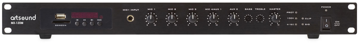 Uniwersalny wzmacniacz miksujący, zdolny do pracy w instalacjach 70V i 100V oraz z głośnikami o impedancji 4-16 Ω. Urządzenie posiada wbudowany tuner AM / FM z pamięcią 100 stacji oraz obsługuje transmisję Bluetooth (wbudowany odbiornik), dzięki czemu MX-120M jest świetnym wzmacniaczem do użytku np. w zakładzie pracy. Wejście USB pozwala na podłączenie pamięci PenDrive oraz odczyt kart SD i odtwarzanie muzyki zapisanej w formacie MP3.