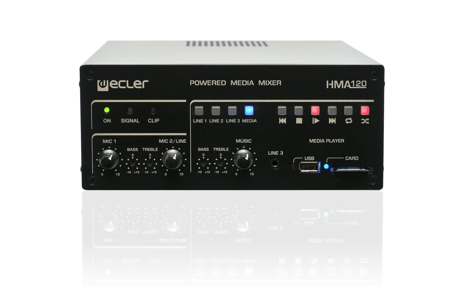 HMA120 to mikser z własnym zasilaniem, zawierający zintegrowany odtwarzacz multimedialny i 5 zewnętrznych wejść audio: 3 x LINE ST, 1 MIC/LINE i 1 MIC. Posiada moc wyjściową 120 W, która obsługuje zarówno linie głośnikowe o niskiej (4 Ω), jak i wysokiej impedancji (70 V, 100 V). Zawiera także 2-poziomowy system priorytetów (przywoływanie, sytuacje awaryjne itp.), automatyczny tryb gotowości, wyjście AUX OUT i dodatkowy port zdalnego sterowania do zarządzania wyborem źródła i głośnością wyjściową za pomocą paneli ściennych z serii WPa. HMA120 to idealne, integralne rozwiązanie dla przyjaznych dla użytkownika i budżetowych projektów audio.