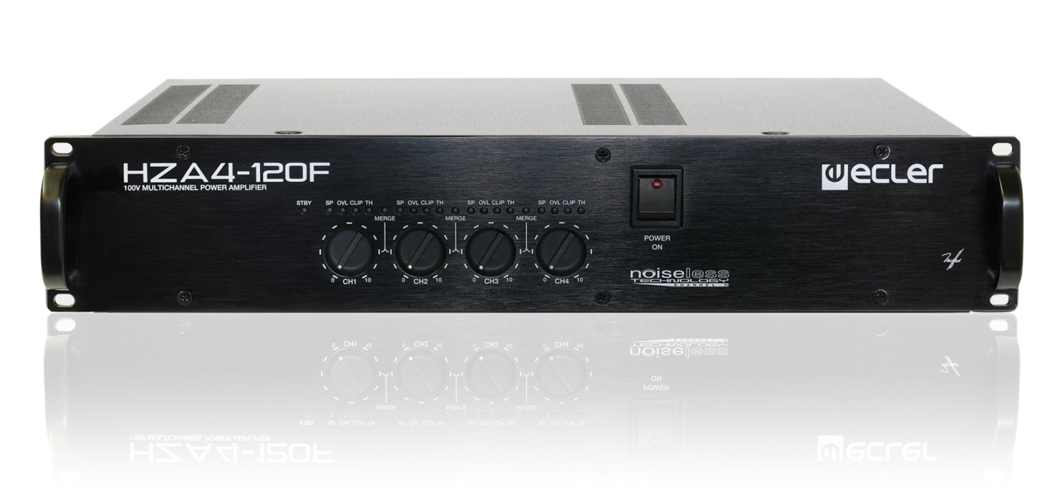 HZA4-120F to czterokanałowy wzmacniacz MERGING z bezpośrednimi wyjściami 4 x 120 WRMS @ 100 V (wysoka impedancja). Integruje zastrzeżoną technologię SPM 100 firmy ECLER – Channel N, która pozwala na podłączenie linii głośnikowych 100 V bez stosowania transformatorów liniowych 100 V na wzmacnianych wyjściach, jak to zwykle ma miejsce w tego typu wzmacniaczach. Fakt ten ma wiele zalet, z których najważniejsze to poprawa jakości dźwięku (szczególnie w niskich częstotliwościach) i 100% ciche chłodzenie konwekcyjne.
