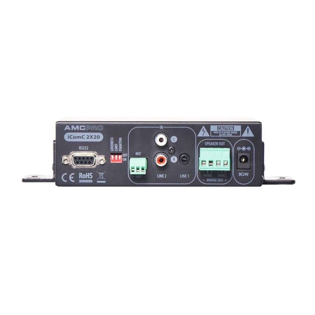 Dwukanałowe wzmacniacze komunikacyjne z interfejsem RS232 i pilotem IR. Zaprojektowany do zastosowań o małych rozmiarach. Wzmacniacz mocy klasy D, ogranicznik, tryb stereo i mostkowy, regulacja barwy dźwięku, wejście liniowe, zbalansowane wejście mikrofonowe, złącze wyjściowe Phoenix, zasilanie phantom i funkcja głośności. Część funkcji można sterować za pomocą pilota IR lub RS232. Nadaje się do montażu na dowolnej płaskiej powierzchni, poziomej lub pionowej. Zasilacz zewnętrzny w zestawie. Pilot na podczerwień jest sprzedawany osobno.
