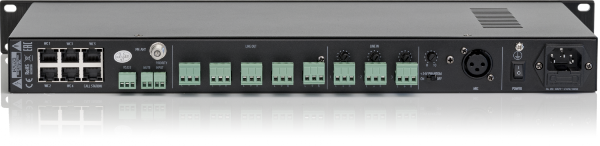 Inputs 3x Stereo phoenix line inputs; 1 x XLR mic input; 1 x RJ45 call station input