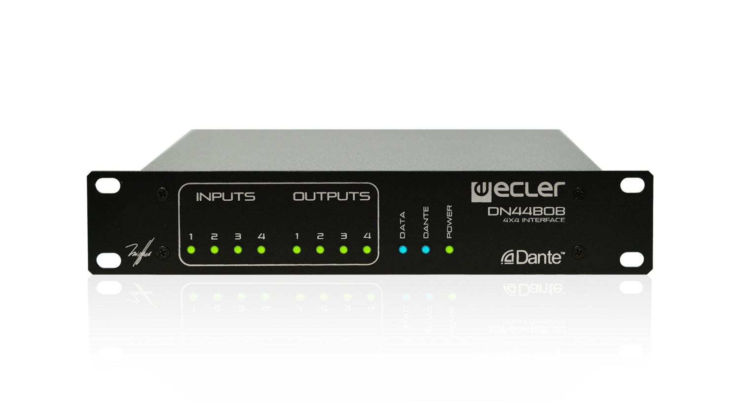 DN44BOB to 4 wejścia i 4 wyjścia DANTE (Audio Over IP) Break Out Box. Umożliwia konwersję 4 analogowych sygnałów audio na 4 kanały DANTE i przesłanie ich do sieci Ethernet LAN, a także pobranie 4 kanałów DANTE z sieci Ethernet i konwersję ich na analogowe sygnały audio. Zawiera 4 porty sterujące GPI (0-10VDC) i 4 porty sterujące GPO (przekaźniki NO/NC). Może być używany razem z produktami EclerNet DANTE lub jako samodzielny interfejs DANTE, razem z dowolnym urządzeniem audio, w tym analogowymi wejściami i/lub wyjściami audio.