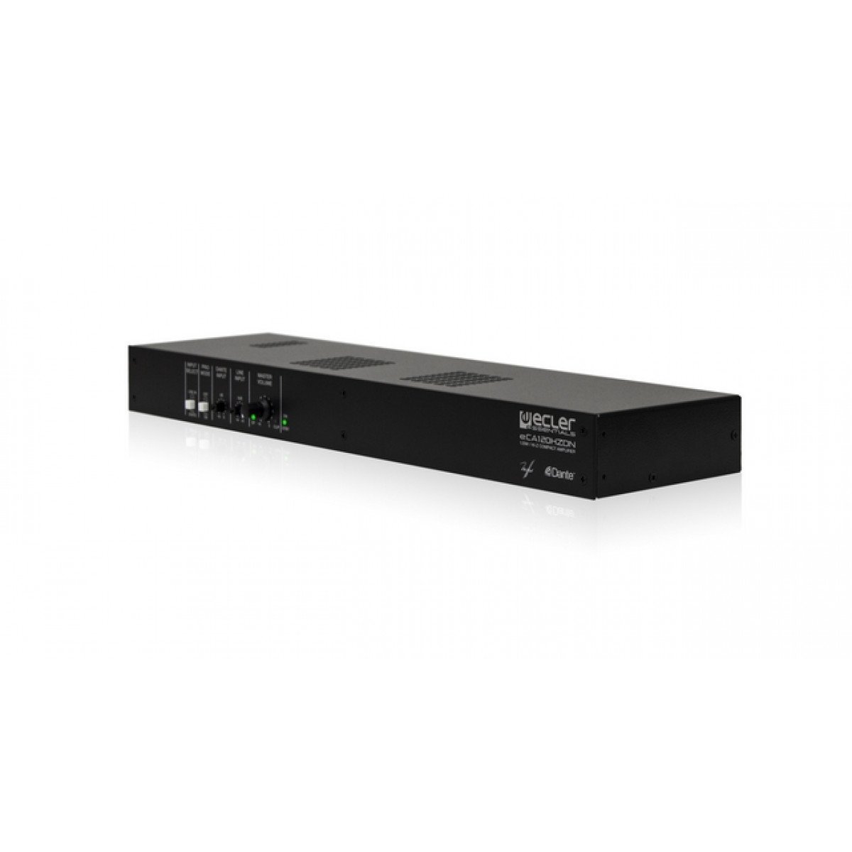 eCA120HZDN to monofoniczny, kompaktowy wzmacniacz o mocy 120 WRMS przy wydajności 100 V (klasa D) do linii o wysokiej impedancji. Posiada 2 analogowe wejścia audio i 2 wejścia audio Dante™, oba z możliwością wyboru funkcji priorytetu (w stosunku do innego sygnału wejściowego), a także dodatkowe wyjście audio. Funkcja automatycznego czuwania (do wyboru) i konstrukcja bez wentylatora (100% cicha). Posiada również port zdalnego sterowania głośnością kompatybilny z serią sterowników ściennych ECLER WPm. W zestawie uniwersalny zasilacz zewnętrzny.