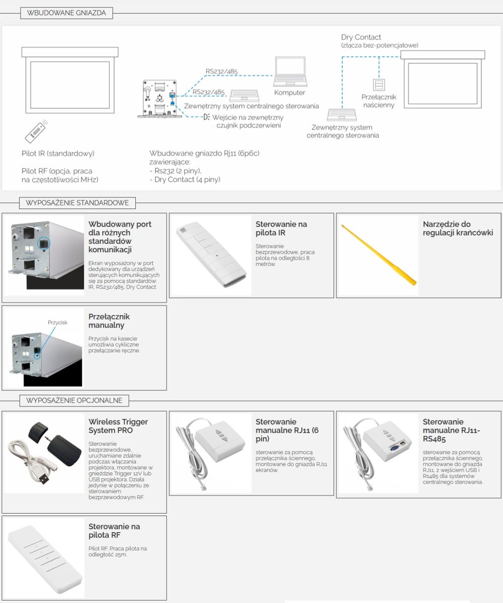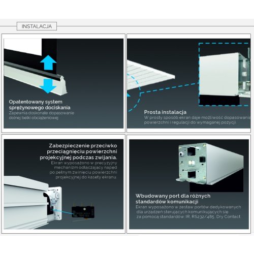 Elektrycznie rozwijany ekran projekcyjny z linii profesjonalnej PREMIUM dedykowany do zabudowy sufitowej ze zintegrowanym sterowaniem IR + RF + złącze RS232/485 + Dry Contact