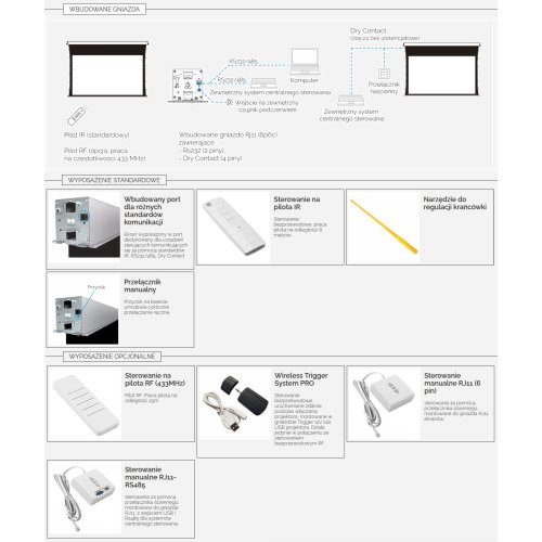 Sterowanie na pilota IR, wbudowany dodatkowy odbiornik RF (pilot RF 868MHz w opcji), złącze RS 232/485 i Dry Contact, Cichy silnik tubowy wbudowany w kasetę ekranu, Wbudowane w kasetę ekranu:
