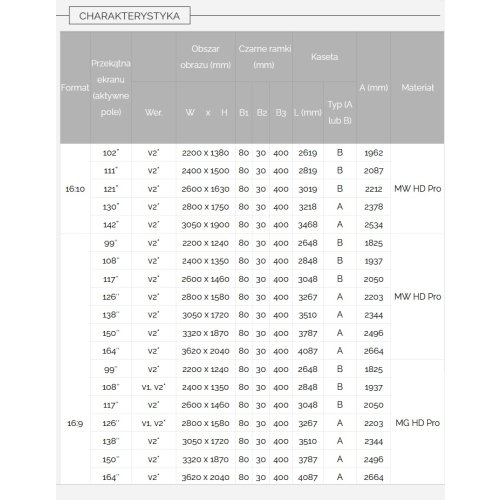 Wysokość kasety do zabudowy tylko 119mm dla ekranów o szerokości do 332cm włącznie oraz 160mm dla większych wielkości,