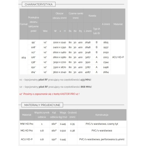 Ekran Elektryczny Do Zabudowy Z Napinaczami Suprema Kastor PRO V1 V2 280x158 cm 16:9 Matt Grey HD PRO