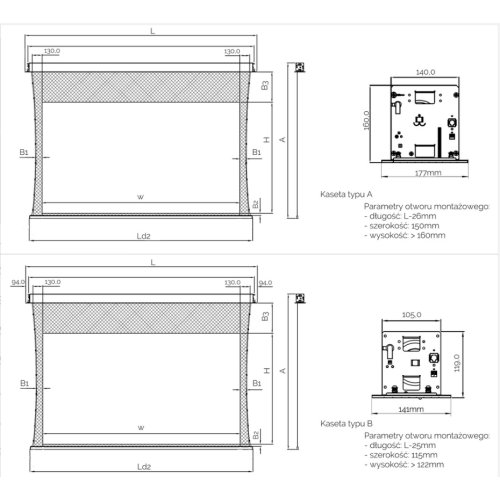 Wysokość kasety do zabudowy tylko 119mm dla ekranów o szerokości do 332cm włącznie oraz 160mm dla większych wielkości,