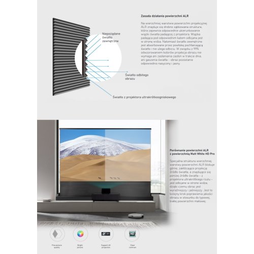 o ALR Lite (Ambient Light Rejection Lite) - materiał projekcyjny wzmacniający strumień światła emitowany przez projektor UST, niwelujący efekt innych źródeł światła, Gain 0.6,