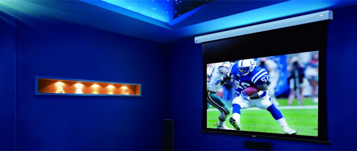 Elektrycznie rozwijany ekran projekcyjny z linii profesjonalnej PREMIUM z systemem bocznych napinaczy i zintegrowanym sterowaniem IR +złącze RS + Dry Contact