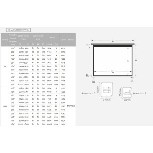 ○ Szerokości 700-800cm kaseta typu B (332x279mm), wałek nawojowy ∅ 200mm,
