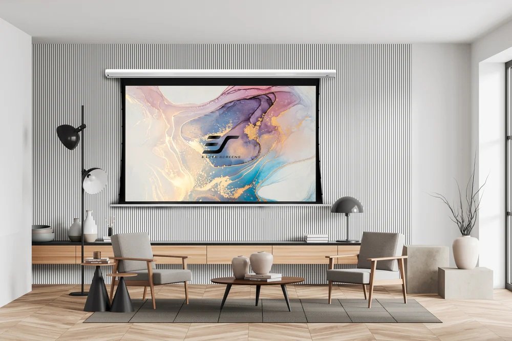 Ekran Elektryczny Ścienno-Sufitowy Z Napinaczami Elite Screens Saker Tab Tension SKT110XHW-E12 244 x 137 cm 110 cali 16:9 Top Drop 30 cm Max White FG Biały
