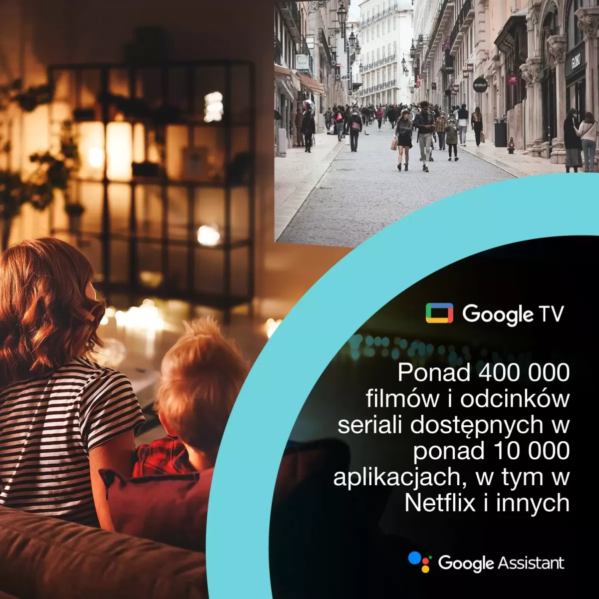 - Google TV i Asystent Google Łatwy dostęp do ponad 400 000 filmów i programów z ulubionych aplikacji i telewizji abonamentowych, takich jak Netflix i nie tylko – wszystko w jednym miejscu*.