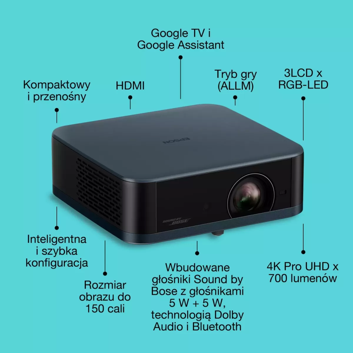 - 4K Pro UHD, 700 lumenów, nawet 3-krotnie jaśniejszy obraz* Oszałamiająca grafika oparta na technologii 3LCD × RGB-LED firmy Epson zapewnia żywsze obrazy.