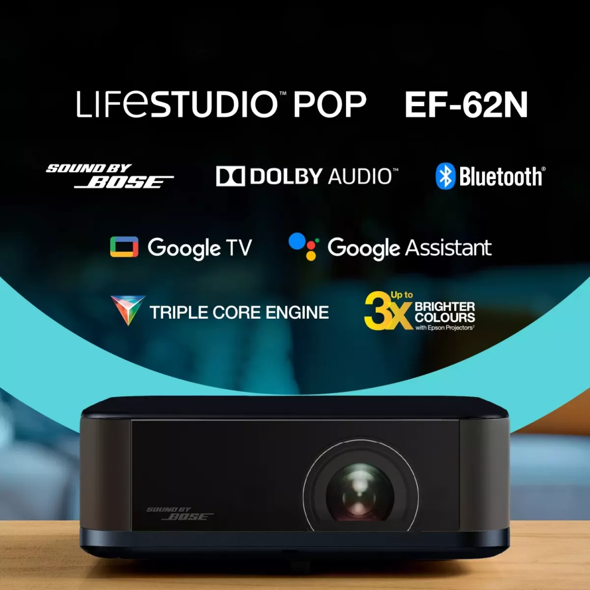 Lifestudio Pop Epson EF-62N, przenośny projektor Smart, Sound by Bose, Google TV, 4K Pro UHD, do użytku wewnątrz / na zewnątrz, 5-letnia gwarancja