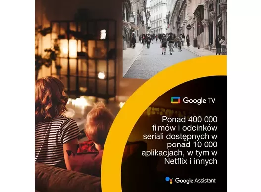 - Google TV i Asystent Google Łatwy dostęp do ponad 400 000 filmów i programów z ulubionych aplikacji i telewizji abonamentowych, takich jak Netflix i nie tylko – wszystko w jednym miejscu*.