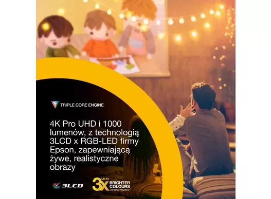 - 4K Pro UHD, 1.000 lumenów, nawet 3-krotnie jaśniejszy obraz* Oszałamiająca grafika oparta na technologii 3LCD × RGB-LED firmy Epson zapewnia żywsze obrazy.