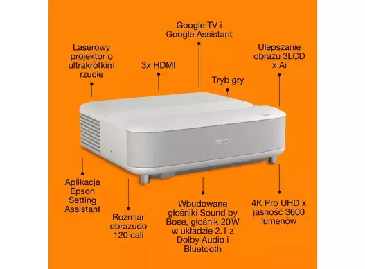- 4K PRO UHD, 120-calowy, immersyjny obraz na dużym ekranie Immersyjne kinowe wrażenia dzięki krystalicznie czystemu obrazowi, rozmiarowi ekranu do 120 cali i łatwej konfiguracji za pomocą aplikacji Epson Setting Assistant