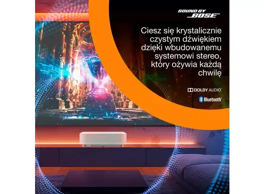 Projektor laserowy Smart o ultrakrótkim rzucie, 4K PRO UHD, optymalizacja obrazu dzięki AI, Sound by Bose, Google TV, ekran do 120 cali, 5-letnia gwar.
