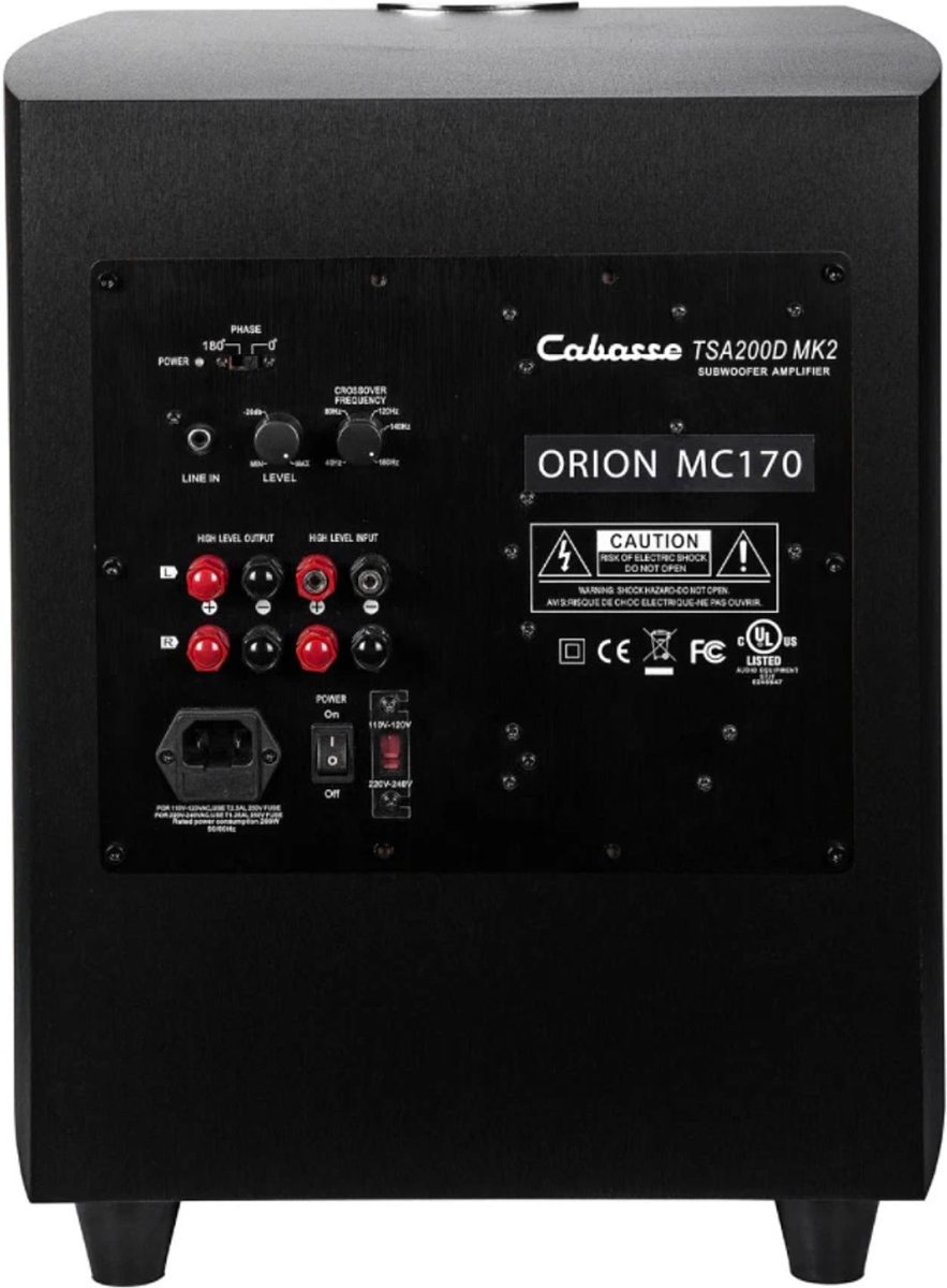 Cabasse Orion MC170 to aktywny subwoofer o paśmie przenoszenia od 35 do 200 Hz. Jest wyposażony w regulowany filtr dolnoprzepustowy od 30 do 180 Hz, pozwalający na idealne zintegrowanie z pozostałymi głośnikami systemu. Konstrukcja subwoofera została zoptymalizowana w celu redukcji wewnętrznych fal stojących, co przekłada się na czystsze i głębsze basy. Certyfikat CE gwarantuje zgodność z europejskimi normami bezpieczeństwa, a włącznik/wyłącznik ułatwia kontrolę zasilania.
