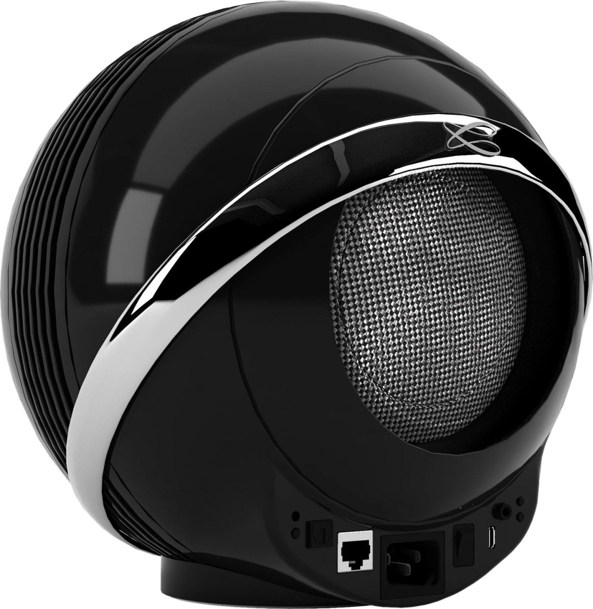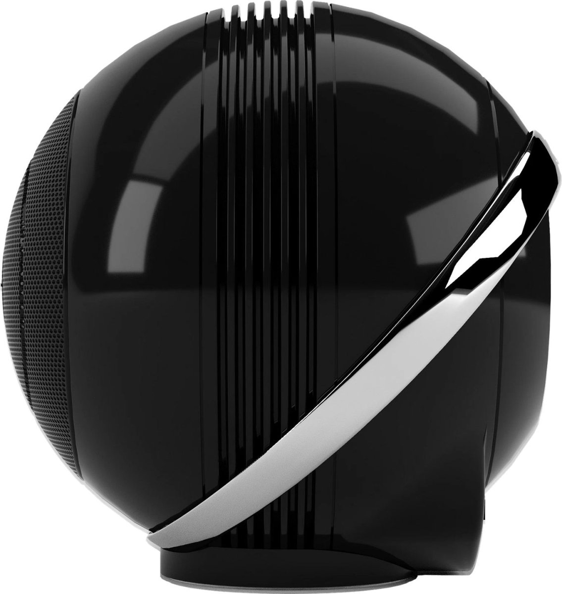 Zestaw audio składający się z dużego, białego, sferycznego głośnika z prążkowanego plastiku na metalowym stojaku, pięciu małych, okrągłych, białych satelitów na okrągłych podstawach, prostokątnego, czarnego wzmacniacza z metalową obudową i okrągłym wyświetlaczem z przodu oraz dwóch czarnych akcesoryjnych modułów, widok z przodu z lekkiego nachylenia