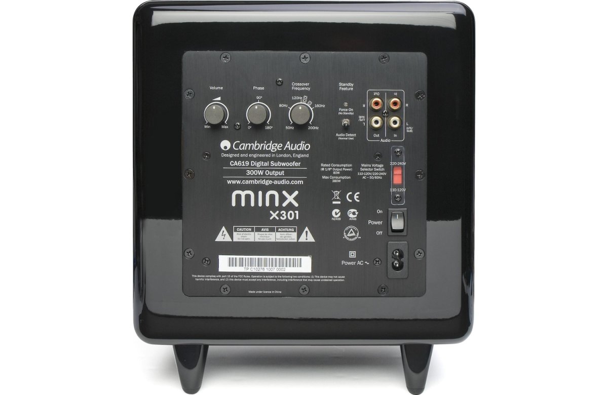 Dodaj wzmocniony bas do stereo i kina domowego dzięki błyszczącemu subwooferowi Cambridge Audio Minx X301 8 "o mocy 300 W. Wykorzystuje 8-calowy stożek niskotonowy ze stopu aluminium do produkcji basów o mocy 300 W oraz dodatkowy 8-calowy radiator basowy (ABR ) pasywny promiennik do wzmacniania basów praktycznie bez szumu powietrznego, posiada charakterystykę częstotliwościową od 31 do 200 Hz, a jego wzmocnienie, fazę i częstotliwość podziału można regulować za pomocą pokręteł na tylnym panelu.