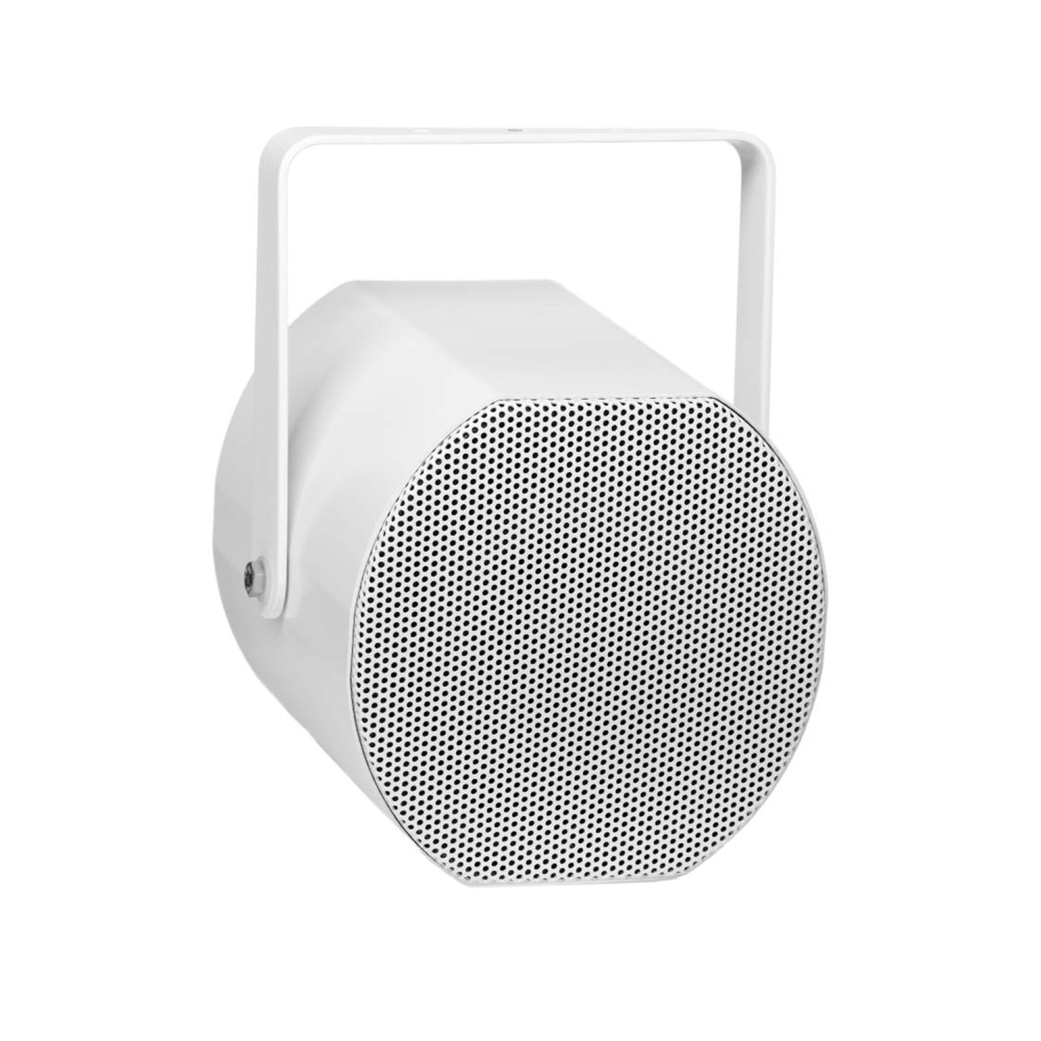 Aluminiowy projektor dźwięku wysokiej wydajności. Współczynnik ochrony IP66. Moc znamionowa 20W/8Ω. Wbudowany transformator o odczepach 100V/20W-10W-5W-8Ω. Pasmo przenoszenia 130 – 20kHz, czułość 94dB (1W/1m). Kolor Biały (RAL9016)