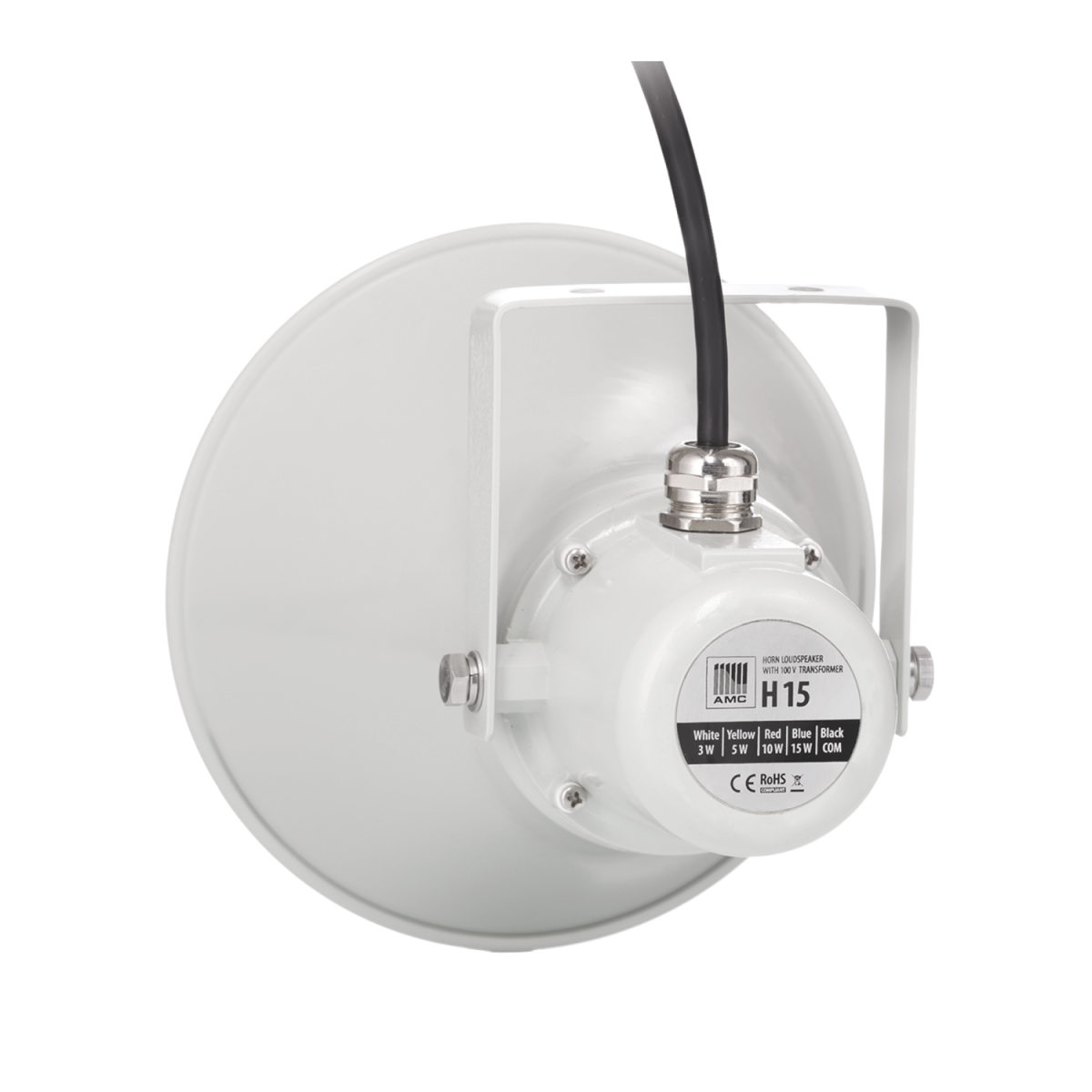 Głośnik tubowy o tradycyjnym wyglądzie, solidnej obudowie i wysokim poziomie SPL. Moc 15W, odczepy transformatora 100V 15W - 10W - 5W - 3W. Skuteczność 103 dB (1W/1m), maksymalny SPL 118 dB. Stopień szczelności IP65. Waga 1,3kg. Kolor biały (RAL9018).