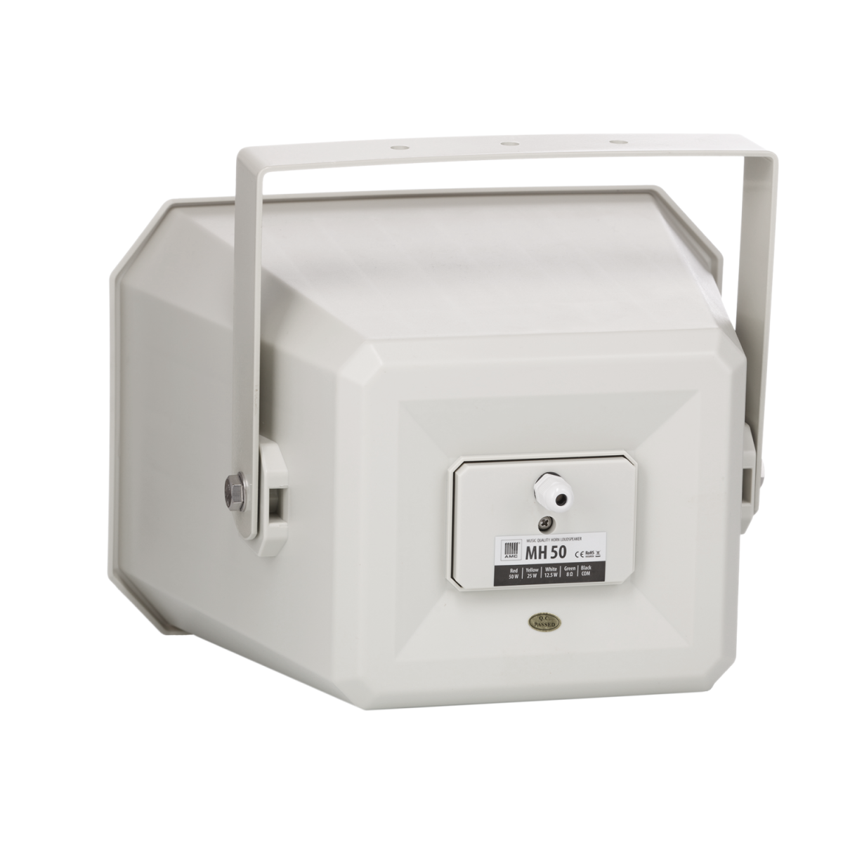 MH50 2-drożne plastikowe głośniki tubowe z wbudowanym transformatorem liniowym 100 V z odczepami mocy i możliwością wyboru impedancji 8 Ω. Parametry tuby są zoptymalizowane pod kątem wysokiej jakości odtwarzania muzyki i mowy w obszarach publicznych i przemysłowych, takich jak parkingi, parki rozrywki, stadiony, tory do jazdy na łyżwach lub place miejskie, a także w magazynach i obiektach przemysłowych.