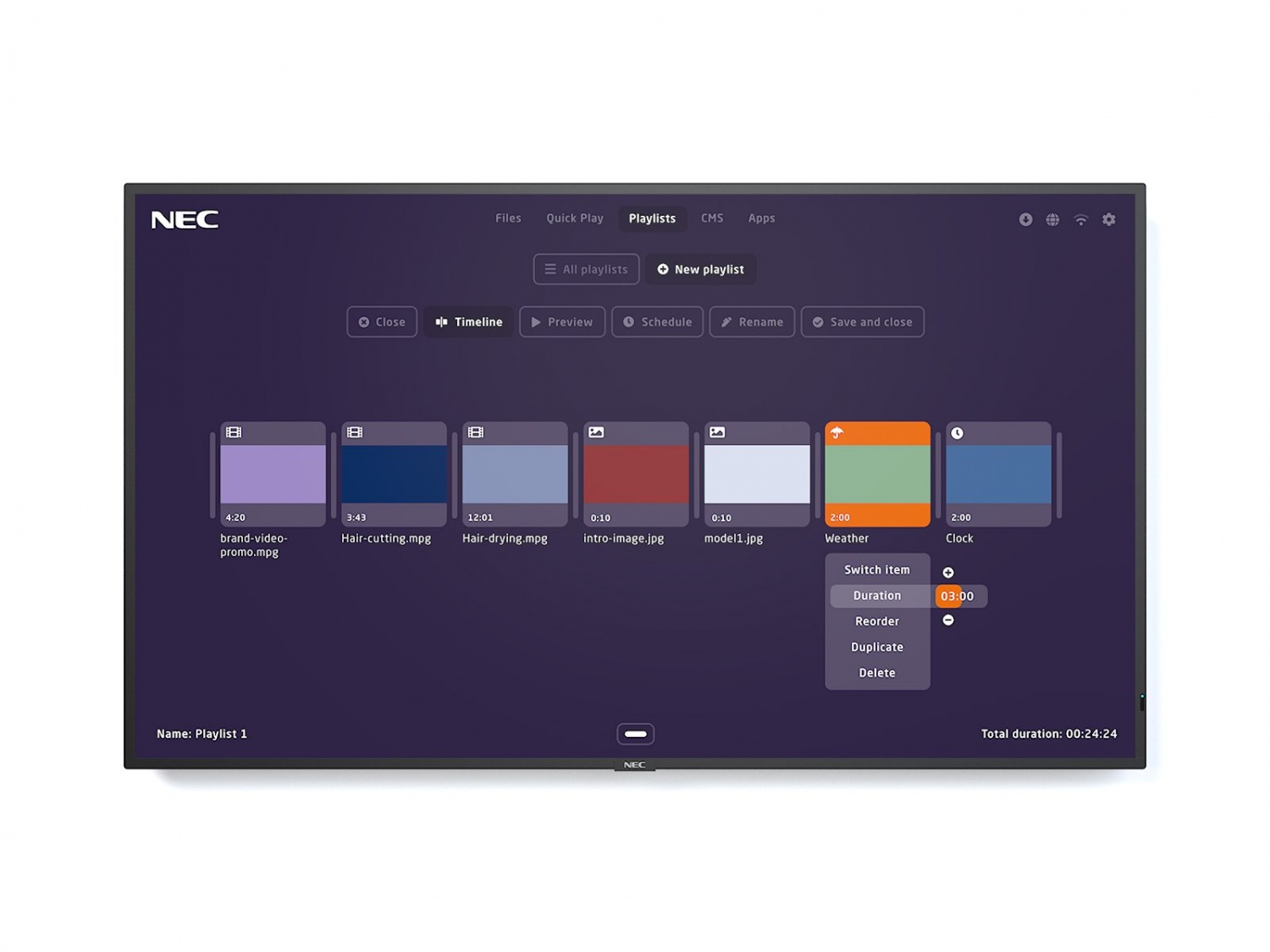 - Wszystko pod kontrolą – pojedynczy interfejs wystarcza do zarządzania zarówno odtwarzaczem NEC MediaPlayer, jak i bezpośrednio wyświetlaczem, poprzez sieć lub za pomocą pilota zdalnego sterowania.