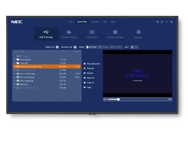 - Wszystko pod kontrolą – pojedynczy interfejs wystarcza do zarządzania zarówno odtwarzaczem NEC MediaPlayer, jak i bezpośrednio wyświetlaczem, poprzez sieć lub za pomocą pilota zdalnego sterowania.