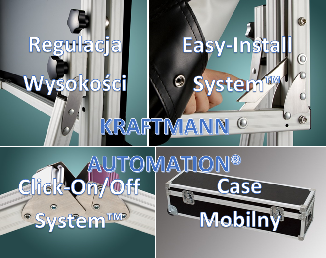 ○ aluminiowa, wzmacniana rama ekranu z zastosowaniem przegubów click-on / click-off (szybko-złączki)
