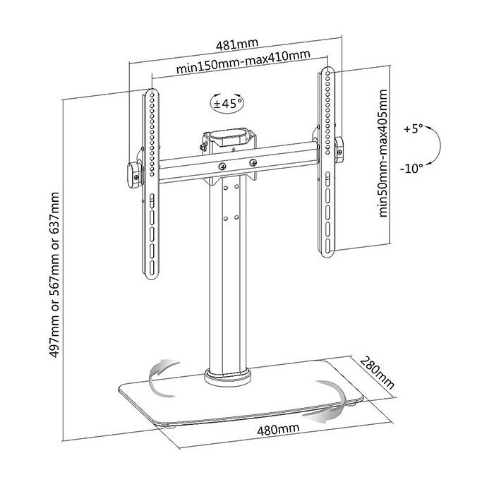 regulacja wysokości telewizora: 497 mm / 567 mm / 637 mm