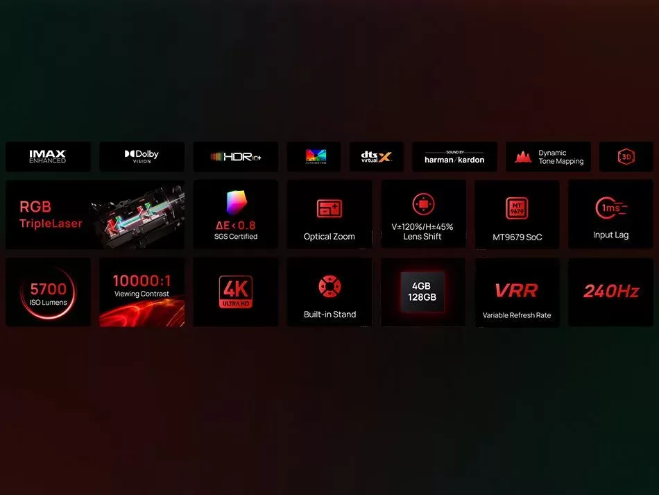Urządzenie zapewnia maksymalną jasność na poziomie 5700 ISO lumenów oraz kontrast 10 000:1 (kontrast dynamiczny 1 000 000:1). Technologia DBLE (Dynamic Black Level Enhancement) pogłębia czerń i wzmacnia kontrast, co pozwala dostrzec detale ukryte w najciemniejszych scenach. Za najwyższą jakość obrazu odpowiada technologia X-Master RGB Triple Laser Engine, wykorzystująca aż 40 chipów laserowych.