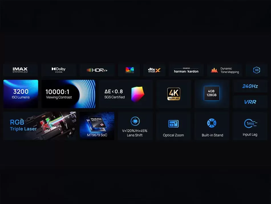 W projektorze zastosowano zaawansowany procesor MediaTek MT9679, zapewniający stabilne działanie urządzenia i szybki dostęp do pożądanych treści audio-wideo, płynne odtwarzanie obrazu w rozdzielczości 4K i niską latencję. Co więcej, urządzenie obsługuje technologię ISA (Intelligent Screen Adaption) w wersji 5.0. Rozwiązanie to znacznie upraszcza obsługę i konfigurację urządzenia. Automatycznie reguluje ostrość (autofokus) i geometrię obrazu (korekcja zniekształceń trapezowych), a ponadto dopasowuje parametry obrazu do powierzchni projekcji (m.in. temperaturę barwową) oraz chroni wzrok użytkowników.